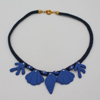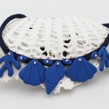 Colgante concha de porcelana con perla de río. Montada con cordón azul marino y cierre metálico. Tamaño de la pieza 60×65 mm. Largo