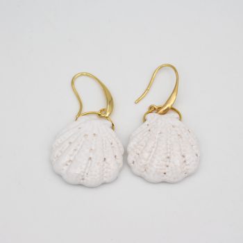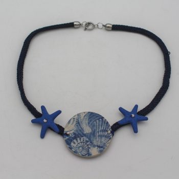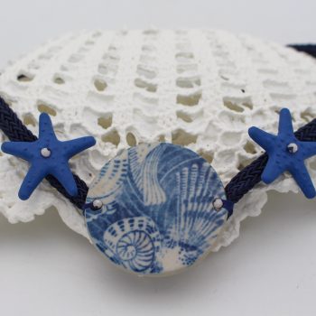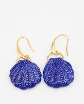 Concha de almeja de porcelana decorada con pigmentos cerámicos y esmaltada en brillo. Fornitura de metal. Acabados: Negro filo de oro(3), , azul cobalto(1). Medidas aproximadas: 35mmx25m